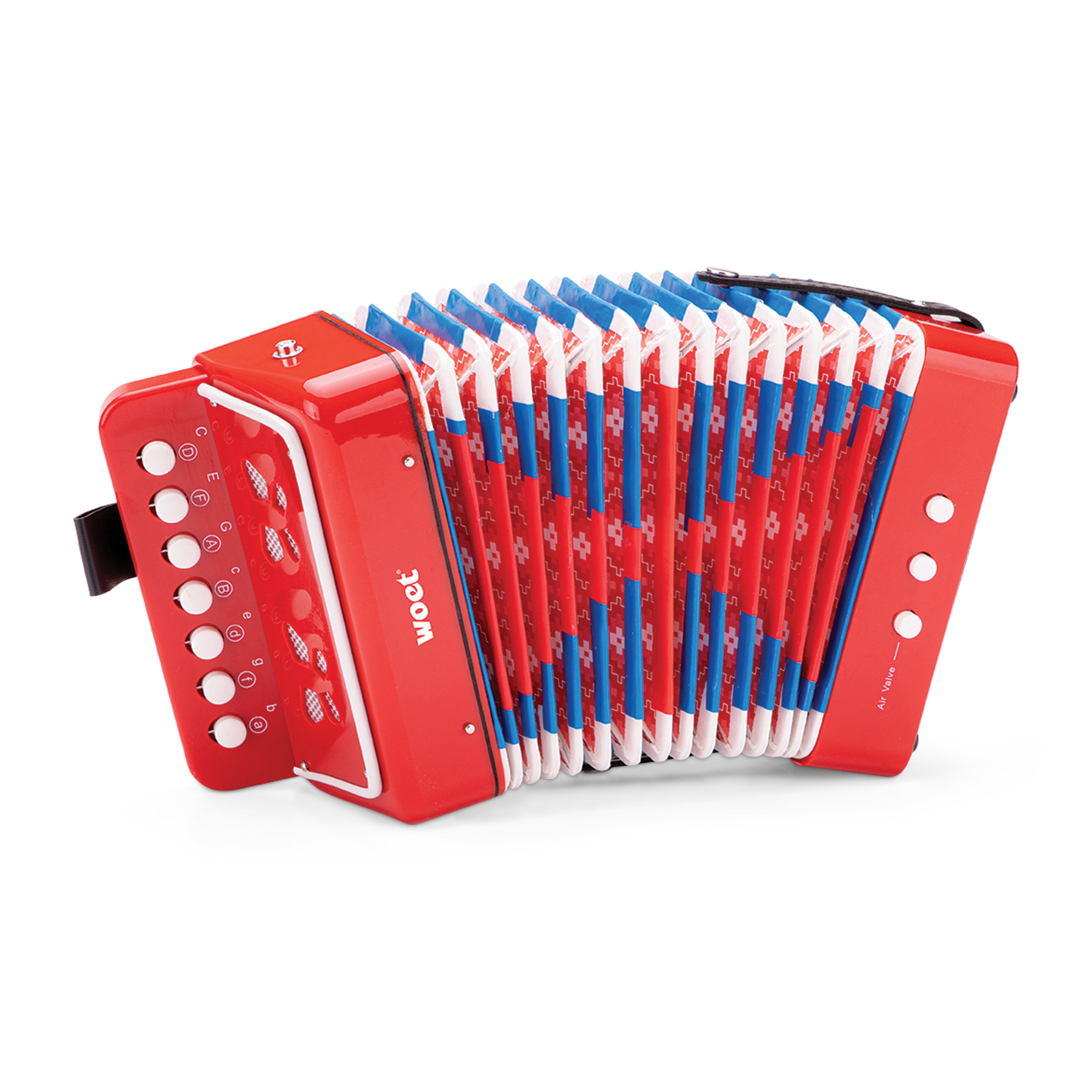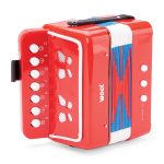 Deze speelgoedaccordeon van Woet® is een geweldige manier om kinderen kennis te laten maken met de wereld van muziek. Ideaal voor het aanmoedigen van jonge muzikanten of gewoon voor veel plezier met het maken van geluid. Deze verkleinde versie van een echte accordeon heeft een klassiek design en een kleurrijke afwerking. De speelgoed accordeon beschikt over twee bas-knoppen, een luchtknop aan de zijkant en zeven knoptoetsen in C.