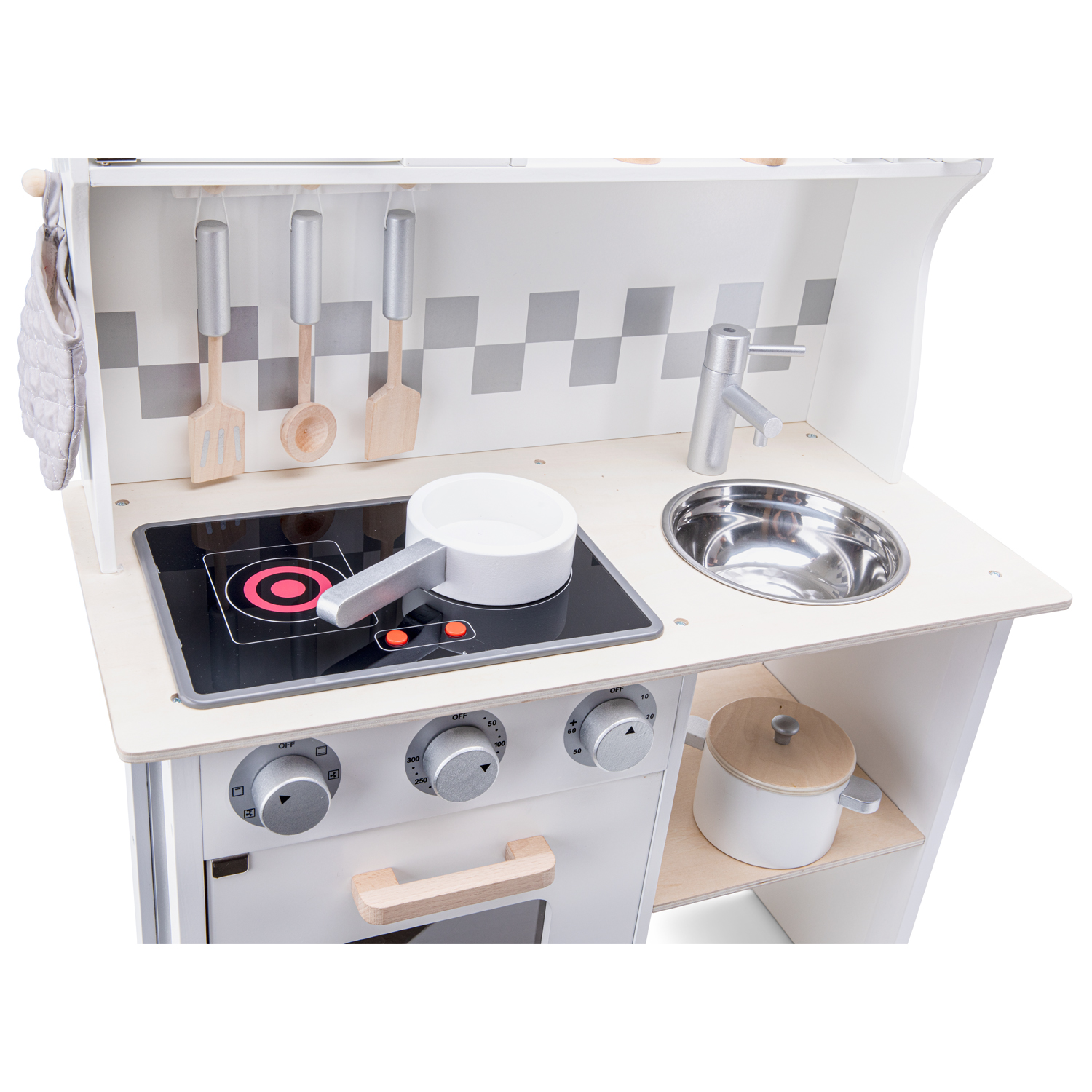 Een complete houten kinderkeuken met kookplaat, oven, magnetron, wasbak, bordenrek, haken voor keukengerei en handige opbergruimte. Inclusief de volgende accessoires: pan met deksel, koekenpan, drie stuks keukengerei, zout en peper, ovenwant en vier borden.