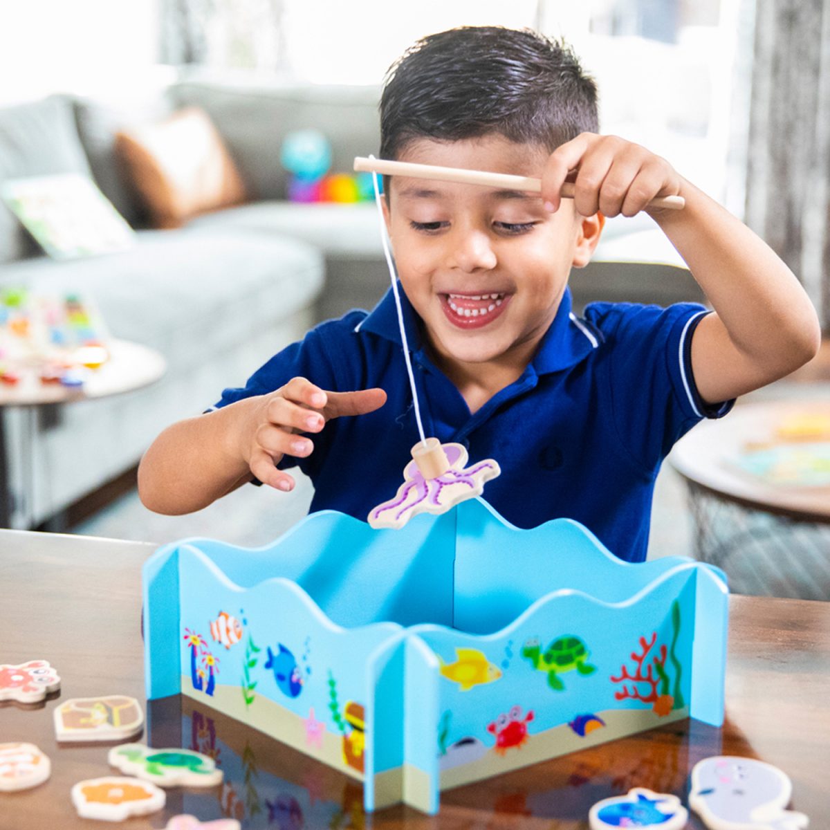 Het spel is eenvoudig op te zetten en weer uit elkaar te halen. Het compacte formaat maakt het makkelijk om overal mee naartoe te nemen of op te bergen. Deze visspelset is een speelse manier om vaardigheden te ontwikkelen terwijl kinderen zich vermaken in hun eigen onderwateravontuur. Een perfect cadeau voor kleine avonturiers die dol zijn op vissen en de zee!