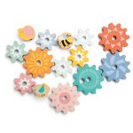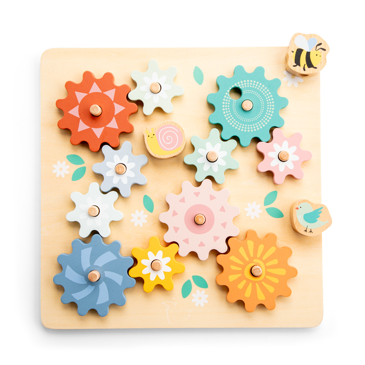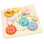 De houten puzzel is vrolijk versierd met bloemen, blaadjes en drie lieve diertjes: een bij, een vogel en een slak. Door de tandwielen op de juiste plek te leggen, oefenen kinderen hun fijne motoriek, concentratie en logisch denken. De zachte kleuren en het stevige houten bord maken dit educatieve houten speelgoed perfect voor kinderen vanaf 2 jaar.