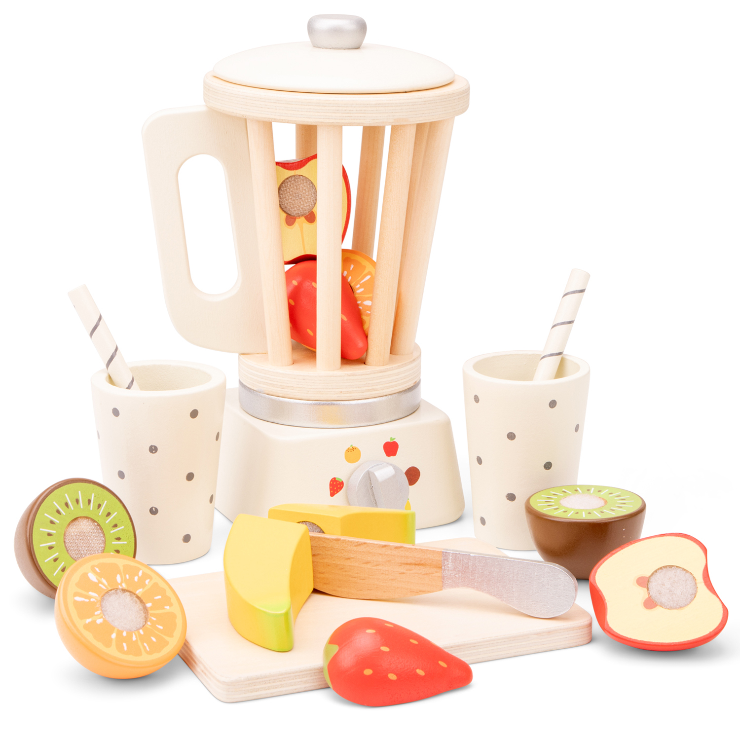 De set bevat een houten blender met draaiknop en deksel, samen met verschillende soorten fruit zoals banaan, aardbei, appel, sinaasappel en kiwi. Het fruit is deelbaar met klittenband, zodat kinderen het eerst kunnen snijden op het snijplankje met het houten mesje. Daarna gaat alles in de blender en kunnen ze hun smoothie uitschenken in de bekers met rietjes.