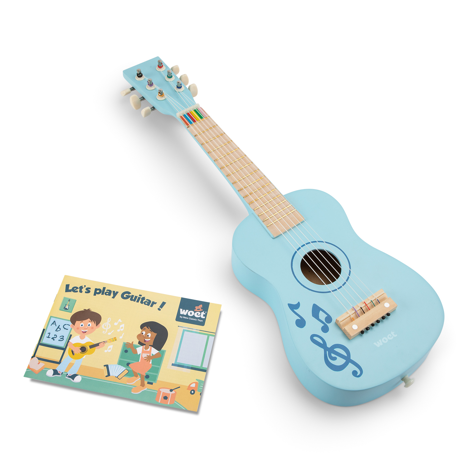 De houten gitaar is voorzien van zes nylon snaren die echt bespeeld kunnen worden. De set wordt geleverd met een draagriem, een reservesnaar en een kleurgecodeerd muziekboekje met drie liedjes. Zo wordt muziek maken eenvoudig, leerzaam en vooral heel leuk.