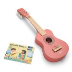 De houten gitaar is voorzien van zes nylon snaren die echt bespeeld kunnen worden. De set wordt geleverd met een draagriem, een reservesnaar en een kleurgecodeerd muziekboekje met drie liedjes. Zo wordt muziek maken eenvoudig, leerzaam en vooral heel leuk.