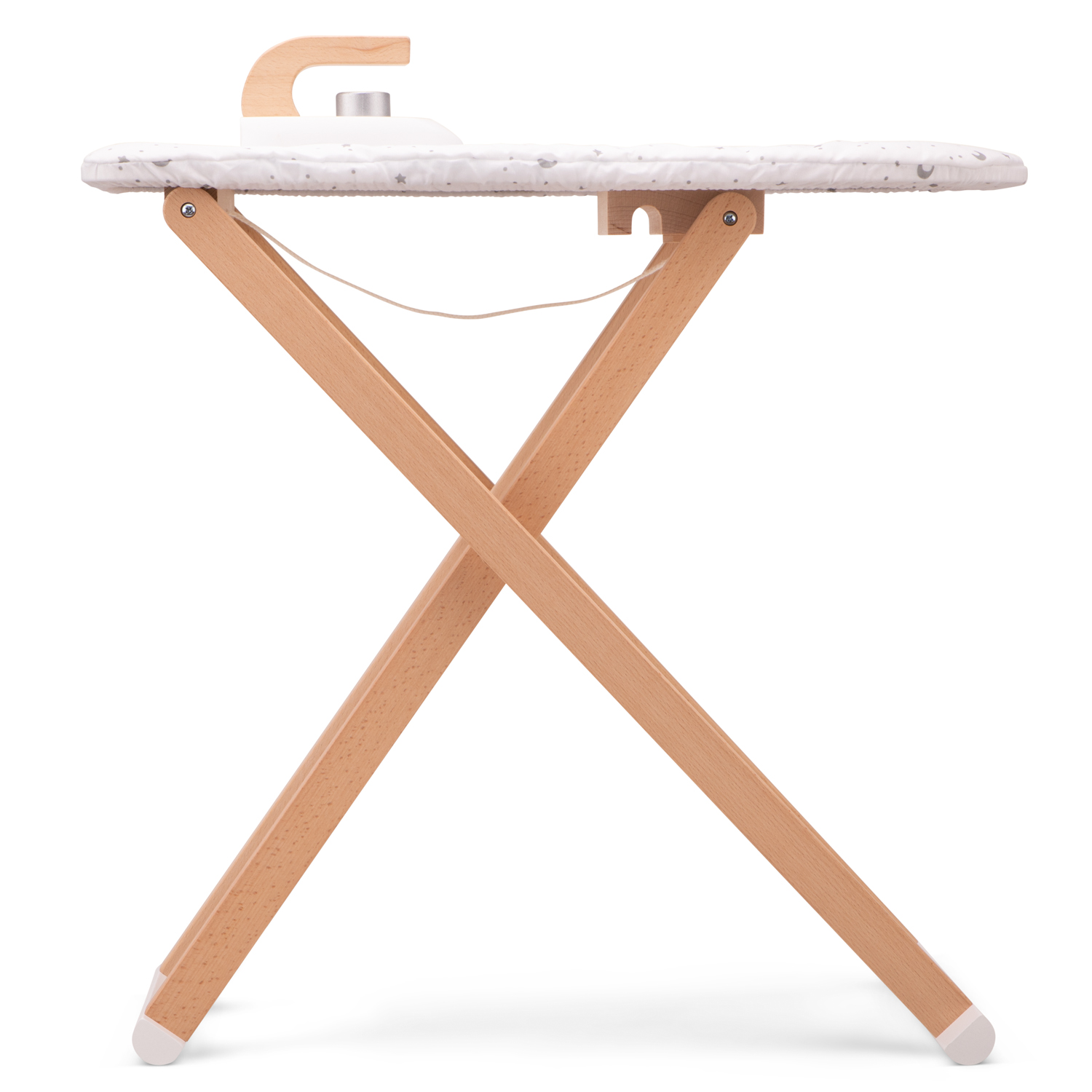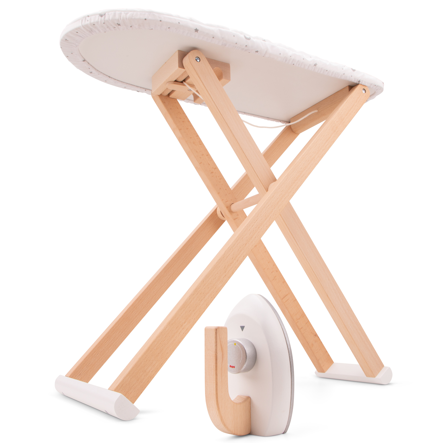 Inclusief een afneembare stoffen strijkplankhoes en een houten strijkijzer met klikgeluiden als je aan de knop draait. De strijkplank is opvouwbaar zodat deze eenvoudig kan worden opgeborgen. Hij heeft de ideale hoogte voor kinderen om mee te spelen en het frame van de strijkplank is gemaakt van beukenhout.
