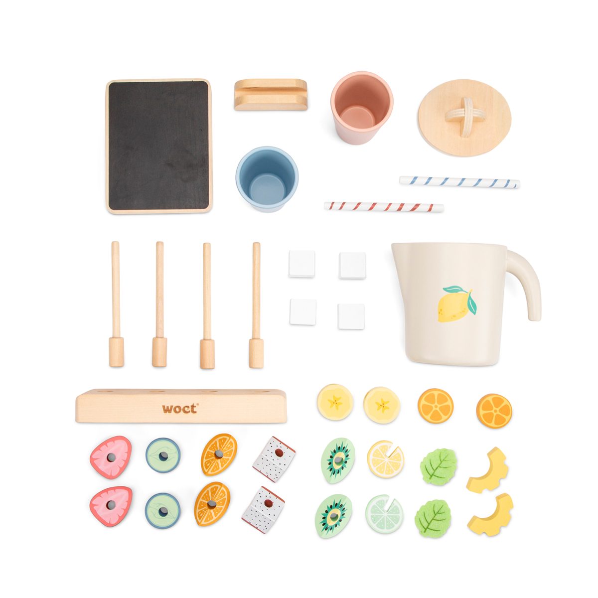 Zin in een zomers speelavontuur? Met fruitige spiesjes, verfrissende limonade en een flinke dosis zonneschijn is deze kleurrijke houten speelset van Woet® perfect voor kinderen die graag mixen, stapelen en serveren. Of ze nu een limonadekraampje runnen, een picknick houden of een zomers café naspelen – deze set brengt hun fantasie tot leven.